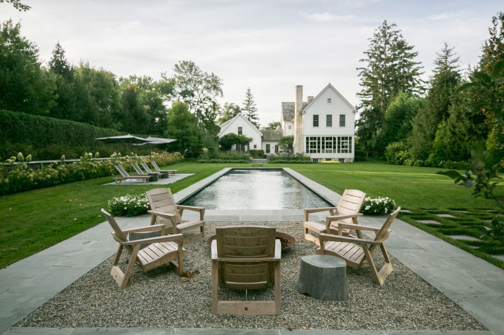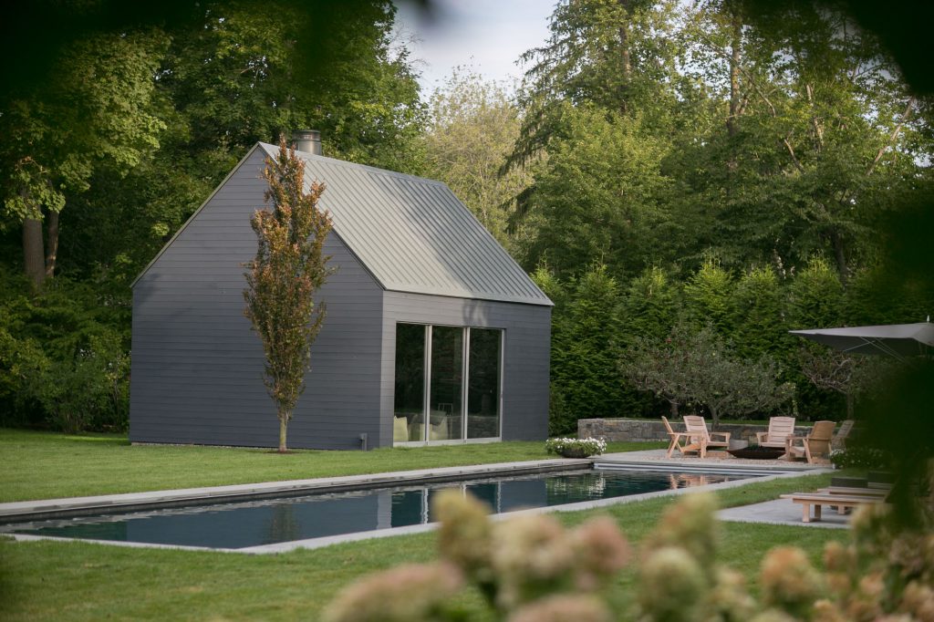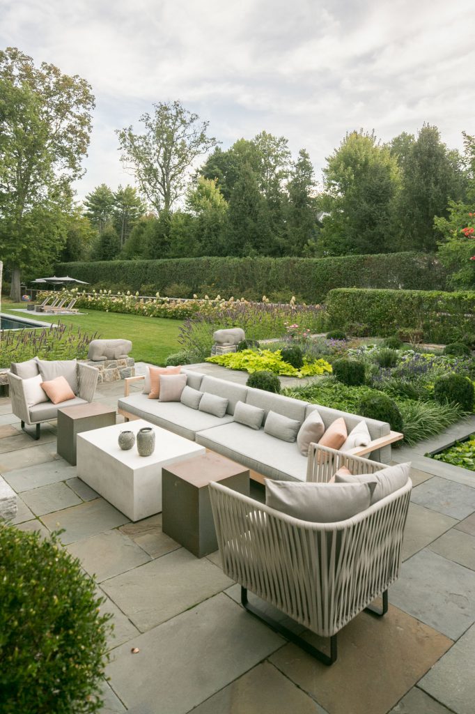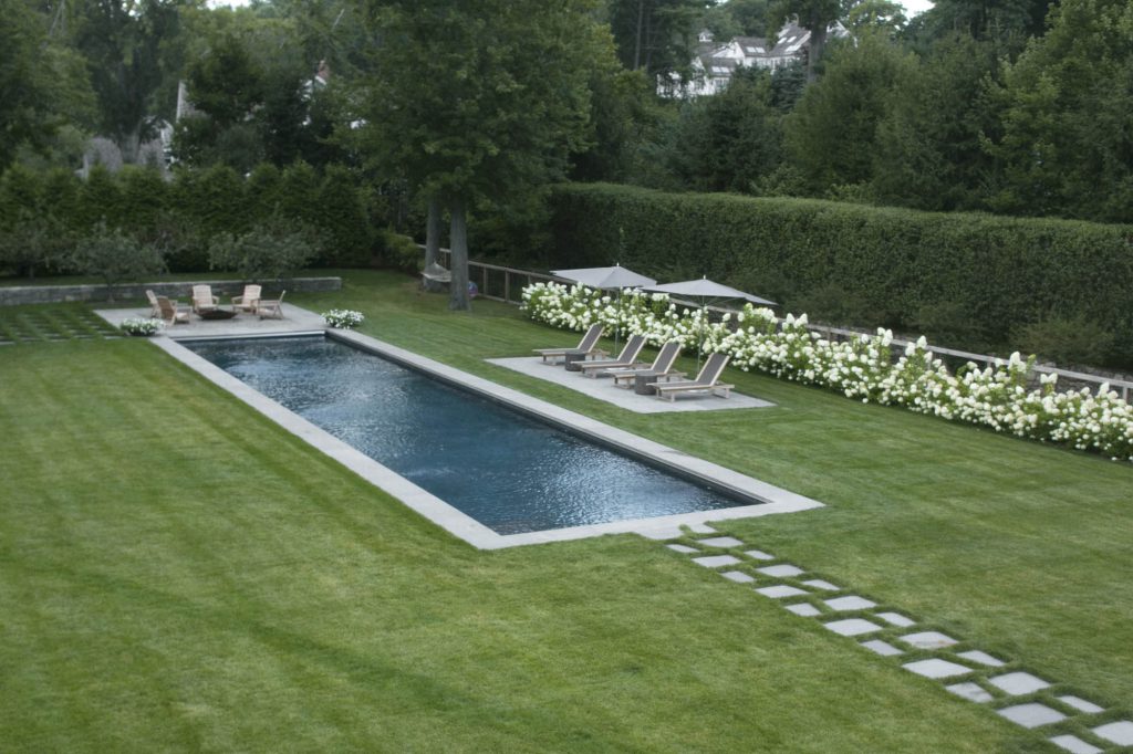There was a strong need for a practical landscape for living. Stone paths and terraces with grass jointing create the framework. Stone terraces step down with the grade, a fishpond parallel to the dining terrace is surrounded by flower and herb gardens. The use of long hedge rows of ‘limelight’ hydrangeas and layered evergreens, as well as small rounded Coral Burst crabapples disguise the fencing and create a privacy solution. The far edge of the property is layered with fruiting orchard apple trees.