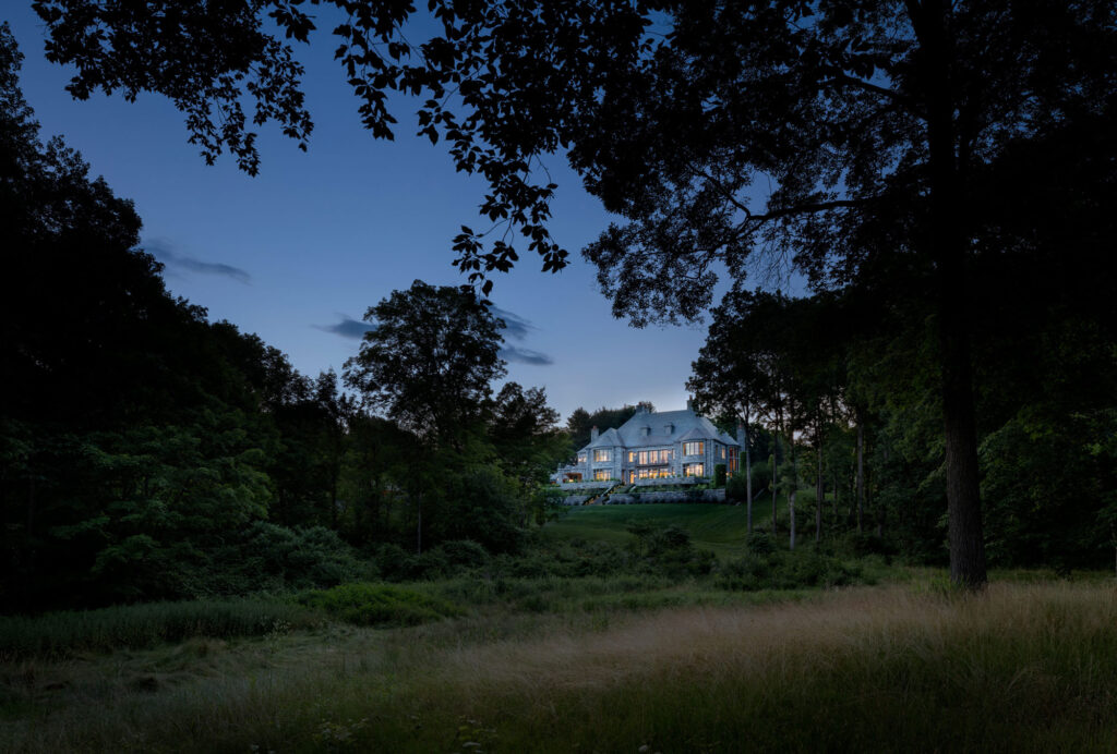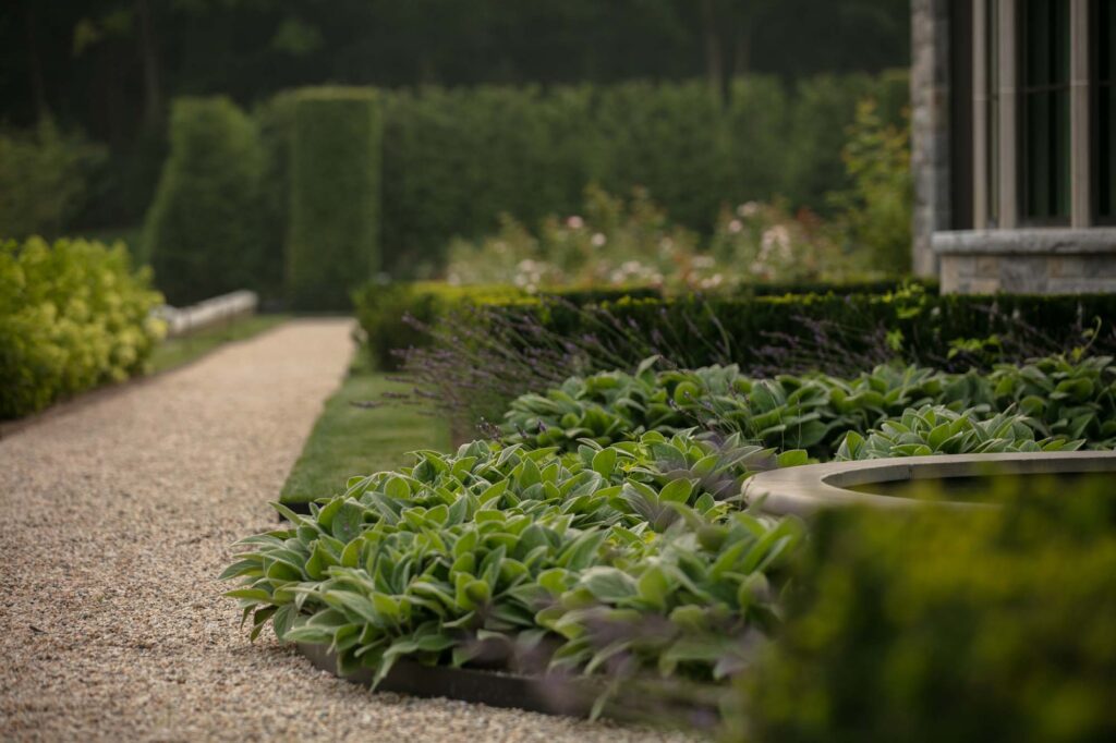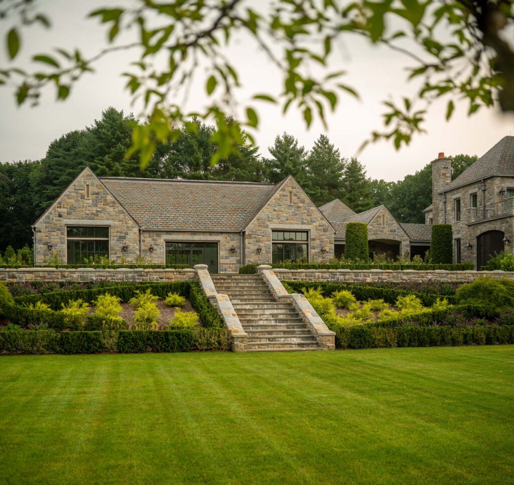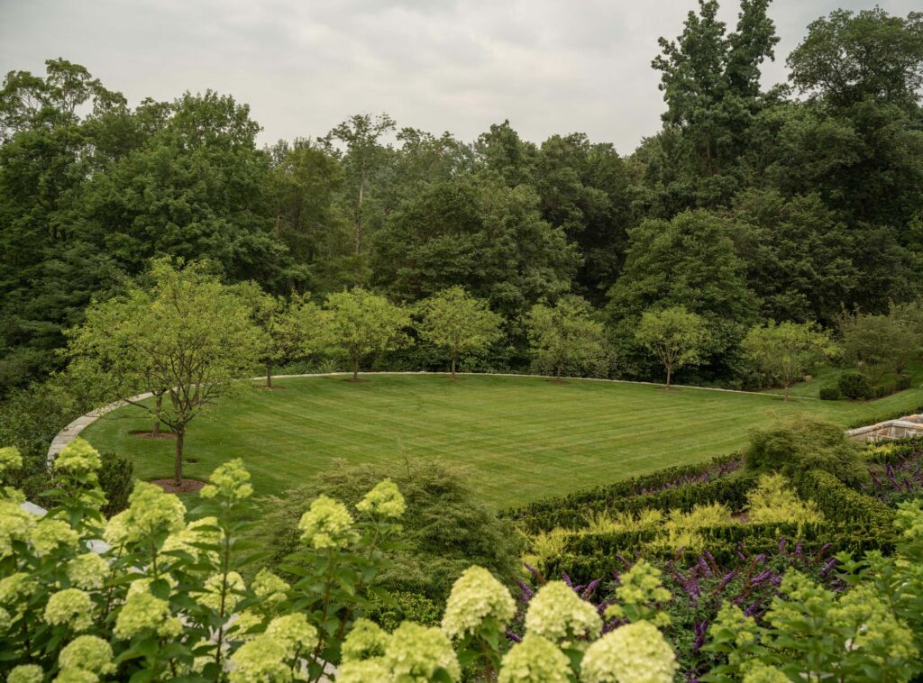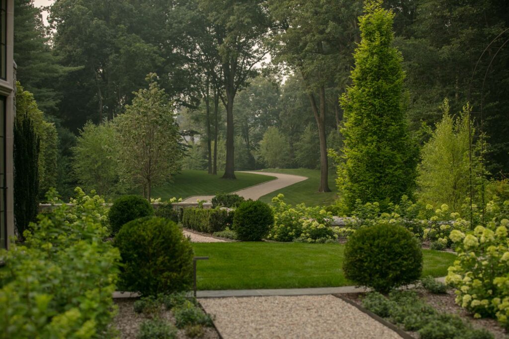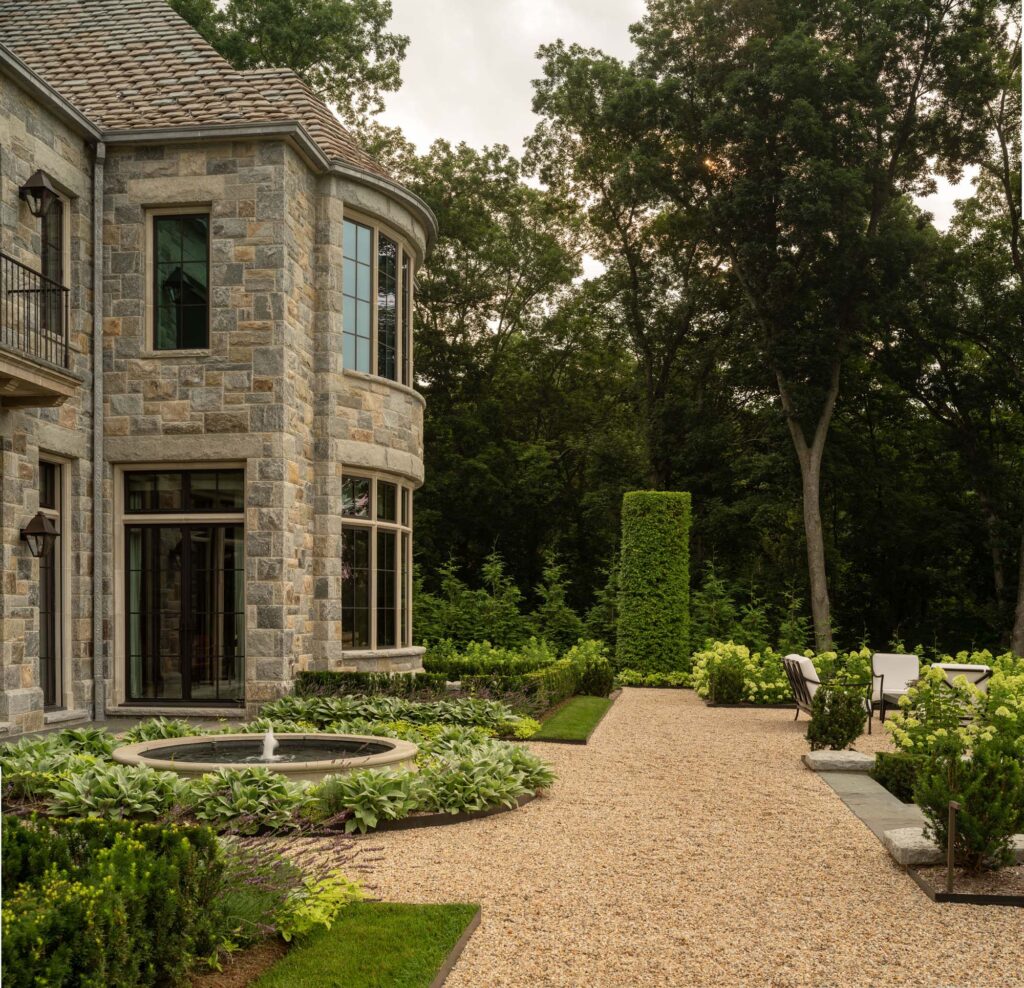 The formal rose garden is curated by a knowledgeable and passionate owner. Specimens of green cut leaf Japanese maple trees, clipped columnar hornbeams, Donald Wyman crabapples, Kousa dogwoods, and magnolias fill the landscape. A nod to the classic garden features of the Dumbarton Oaks, an urn sits atop a pedestal surrounded by iron arches as the focal point out of the library windows. Subtle curves wind through the gently graded slopes leading to the residence in the front and rear. Leading away from the home towards the natural meadows, woodland hiking paths, lake, and vegetable gardens beyond, the paths transition from formal to informal. Hand carved stone risers encase lawn landings to guide the way through the property.